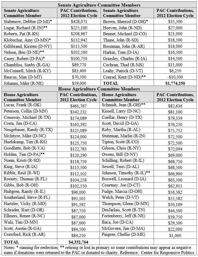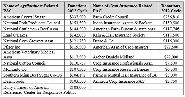 The agribusiness and crop insurance sectors also exert influence by contributing to political campaigns, particularly to members of Congressional Agriculture Committees. Combined, they have given $16.4 million in campaign contributions so far this election cycle. Twenty percent, or about $3.2 million, of these Political Action Committee (PAC) donations came from the crop insurance industry, groups lobbying on crop insurance topics, or insurance companies benefiting from $1.3 billion in annual taxpayer subsidies. Agribusiness and crop insurance PACs send 40 percent of their campaign contributions to members of the House and Senate Agriculture Committees even though these individuals only make up 12 percent of Congress. Below is a list of the largest agribusiness and crop insurance-related contributors to the agriculture committees.