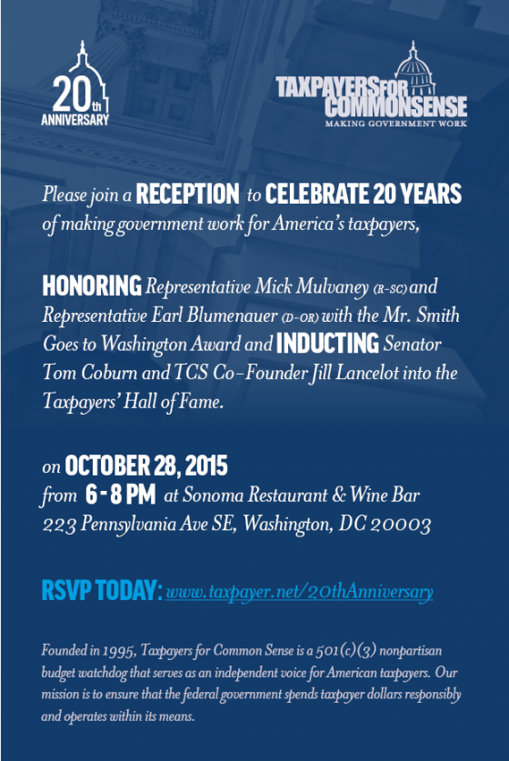 For two decades, Taxpayers for Common Sense (TCS) has served as an independent voice for American taxpayers, making sure that the federal government prioritizes responsible policy making over the interests of a chosen few. To celebrate this milestone we are hosting a reception the evening of October 28, 2015 at Sonoma restaurant and Wine Bar in Washington, DC.