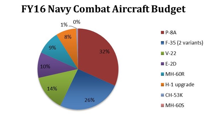 This chart represents the Department of the Navy “combat aircraft” account for FY16. (Note that the Navy also buys planes for the Marine Corps.) The P-8 is the largest piece of the pie, with the F-35 coming in second. Overall, the chart shows some balance and a sense of the need for trade-offs to purchase all the airframes necessary for the future of Naval Aviation.