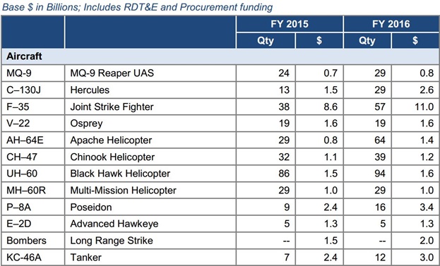 The Pentagon is asking to purchase 57 F-35s in FY16 – that’s 19 more than the 38 they received in the final FY15 bill. The overall cost of those 57 airframes is slightly more than $11 billion (that’s both procurement and research and development.)