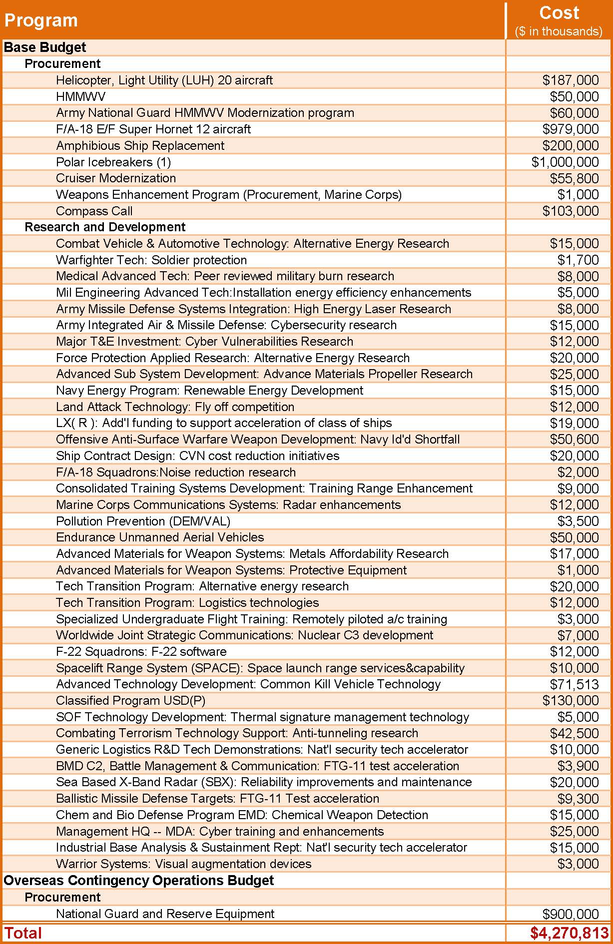 The Senate also showed a touch more restraint on the topic of giving money to programs the Pentagon didn't request at all. The Senate “only” devoted $4.2 billion to programs the Pentagon believes it can do without (see list at right). That's about a third less money than the House. Unfortunately, there is very little overlap between the two lists. This means the most likely outcome is that close to $11 billion will somehow be added to the Pentagon's budget to pay for programs they haven't requested. And while these programs don't meet the usual definition of an earmark, I'll be looking for details on where these programs are made and which contractors benefit from the Congressional largesse.