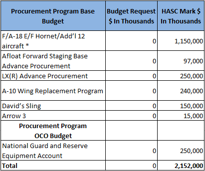 Yesterday, the House Armed Services Committee (HASC) released the “Chairman’s Mark” of the annual Defense Authorization bill, setting policy for the Pentagon. From a budget perspective, the rubber doesn’t meet the road on the actual spending of our tax dollars until the Appropriations Committees have their say. But the HASC mark does give us an idea which way the wind is blowing in terms of adding procurement programs where the Pentagon asked for zero dollars.