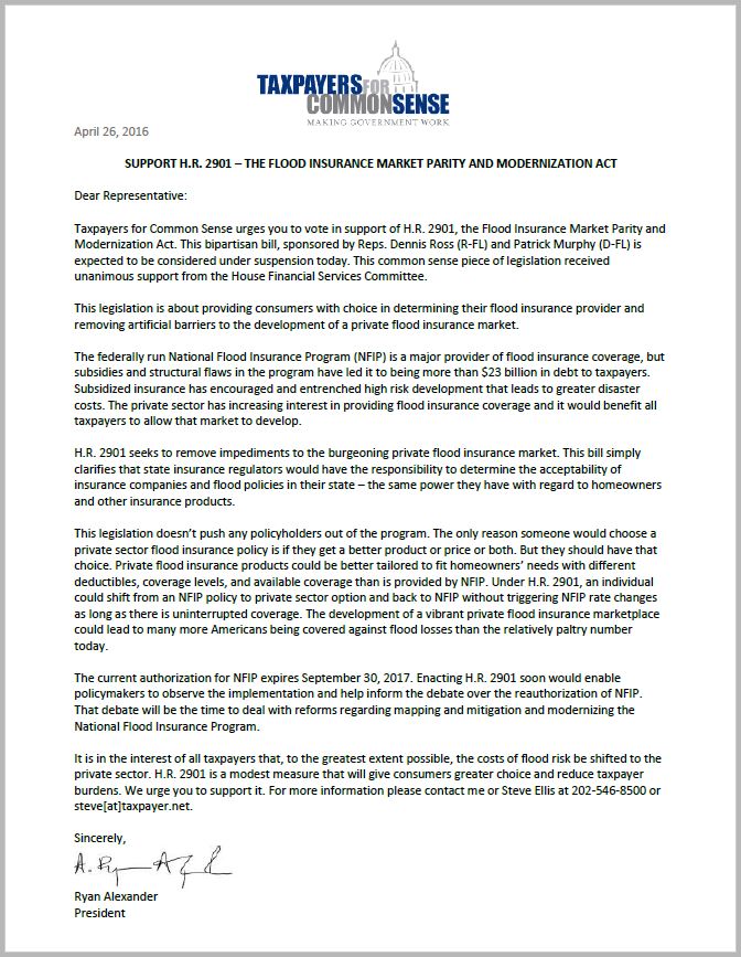 On Tuesday, TCS sent a letter to the House of Representatives voicing its strong support for H.R. 2901 – the Flood Insurance Market Parity and Modernization Act – and encouraging Members to pass the bill when it comes up for a vote. The bipartisan bill sponsored by Reps. Dennis Ross (R-FL) and Patrick Murphy (D-FL) would simply remove obstacles for a budding private flood insurance market. Doing so would provide consumers with greater choice when buying flood insurance, and could potentially lessen the liability taxpayers bear through the National Flood Insurance Program. The full text of the letter is provided below: